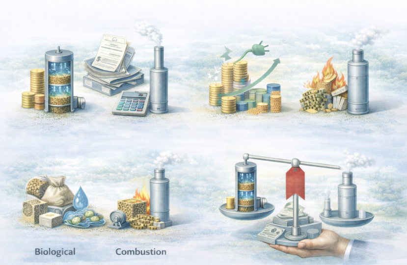 수명 주기 비용은 초기 투자비와 운영비, 유지관리비를 모두 포함한 장기적 비용 개념입니다. 저농도 악취 및 휘발성유기화합물 처리 조건에서는 생물학적 공정이 가장 경제적인 선택이 되는 경우가 많습니다. 반면 고농도·저풍량 조건에서는 촉매 산화 공정이 더 효율적일 수 있습니다. 따라서 경제성 평가는 오염 특성과 설비 운영 기간을 함께 고려해야 합니다.