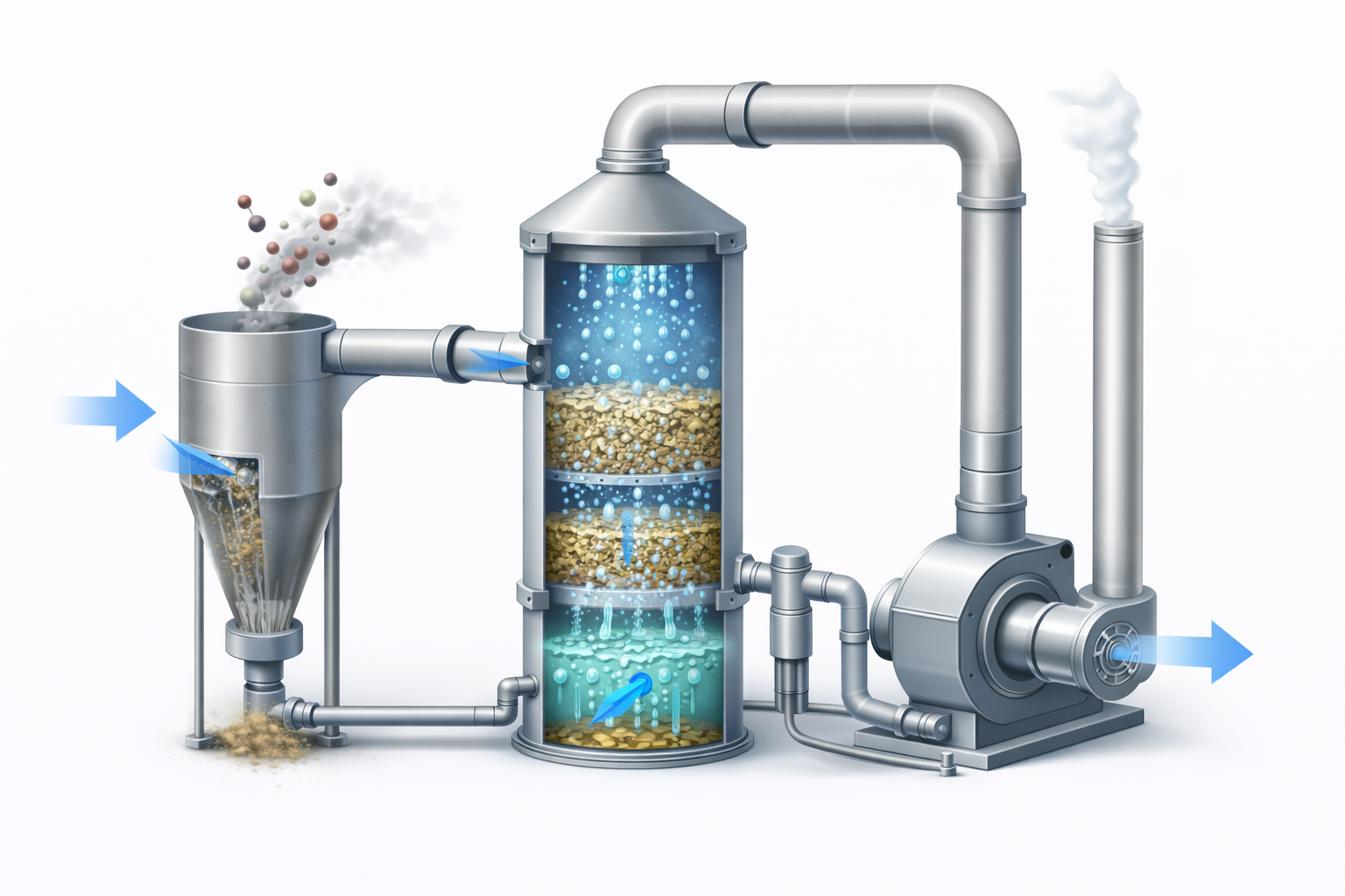 복합 시스템에서 집진부는 단순한 전처리 장치 이상의 의미를 가집니다. 집진부에서 분진이 충분히 제거되지 않을 경우, 흡수 공정에서 흡수액 오염, 노즐 막힘, 충전물 부착 등의 문제가 발생할 수 있습니다. 이는 곧 처리 효율 저하와 유지관리 비용 증가로 이어집니다. 따라서 집진부의 설계는 처리 대상 가스의 분진 농도와 입자 크기 분포를 고려하여 결정되어야 합니다. 고농도 분진이 포함된 경우에는 사이클론과 백필터를 병용하는 방식이 적용될 수 있으며, 미세입자 제거가 중요한 경우에는 전기집진기가 선택되기도 합니다. 이처럼 집진부 구조는 흡수 공정의 안정성을 확보하는 핵심 요소로 작용합니다.